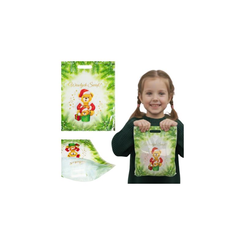 Firma GRALA oferuje torbę reklamową, reklamówkę świąteczną, na święta z nadrukiem "misia mikołaja", z uchwytem tzw. rączką (nerką) wzmocnioną dodatkowo o wklejkę oraz z atestem PZH do kontaktu z żywnością.