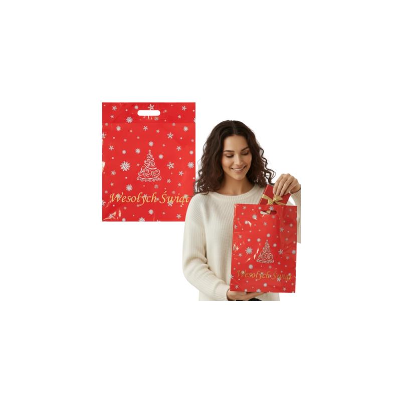 Firma GRALA oferuje czerwoną torbę reklamową, reklamówkę świąteczną, na święta z nadrukiem "choinki z napisem Wesołych Świąt", z uchwytem tzw. rączką (nerką) wzmocnioną dodatkowo o wklejkę oraz z atestem PZH do kontaktu z żywnością.